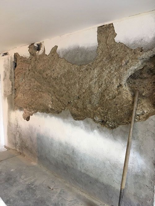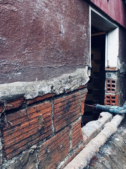 On the outside, the previous homeowners had installed sheet metal from the bottom of the siding to a foot below soil level, making it impossible to see the actual foundation holding the house up without destroying the finishes that had been put in place. The owner had lived there for 13 years without realizing how flimsy the construction was.